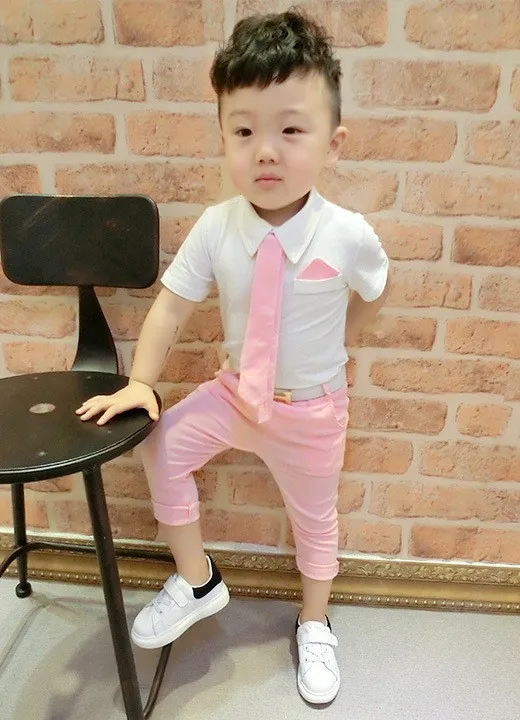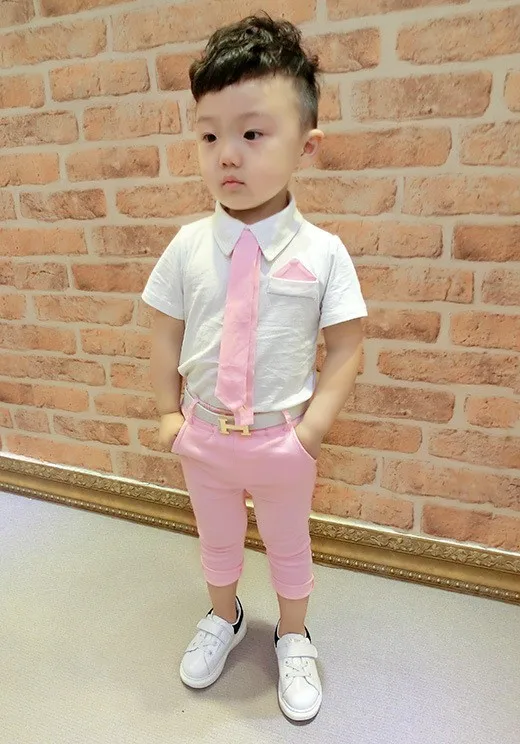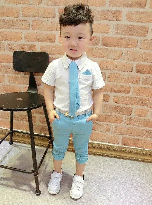 Special Offer 2017 zomer geschikt voor jongens merk kinderen trouwjurk gentleman katoen shirt tie pak + broek en riem baby pak Discount 0% Today!