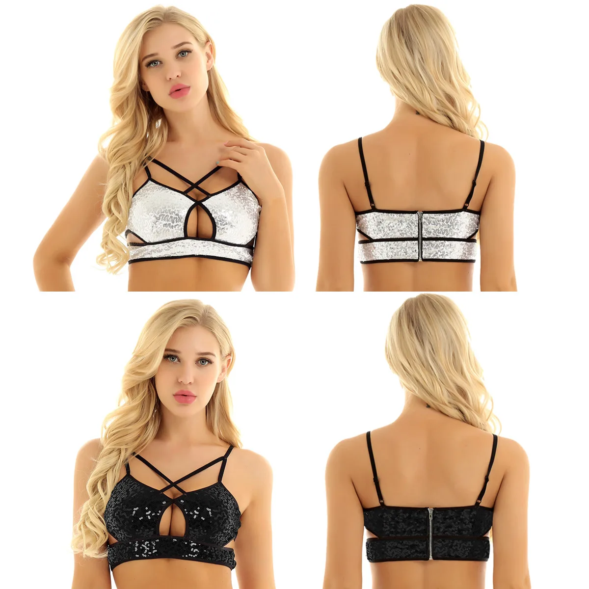 Special Offer Vrouwen Tank Tops Mode Zomer 2019 Crop Top Cropped Shiny Sequin Verstelbare Hollow Out Bralette Beha Rave Party Dance Bra tops Discount 0% Today!
