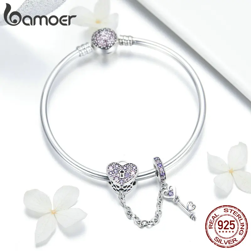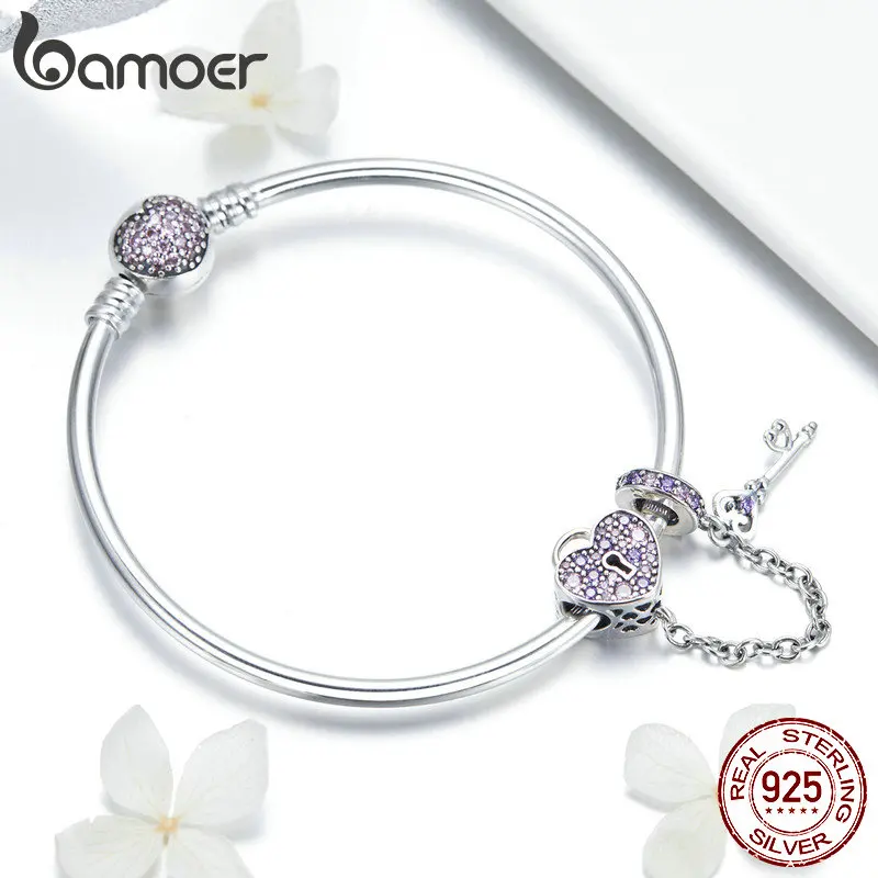 Special Offer BAMOER Echt 925 Sterling Zilveren Liefde Sleutel Hart Vorm Armbanden Armbanden voor Vrouwen Paars Zirkoon Valentine Gift Sieraden SCB820 Discount 30% Today!