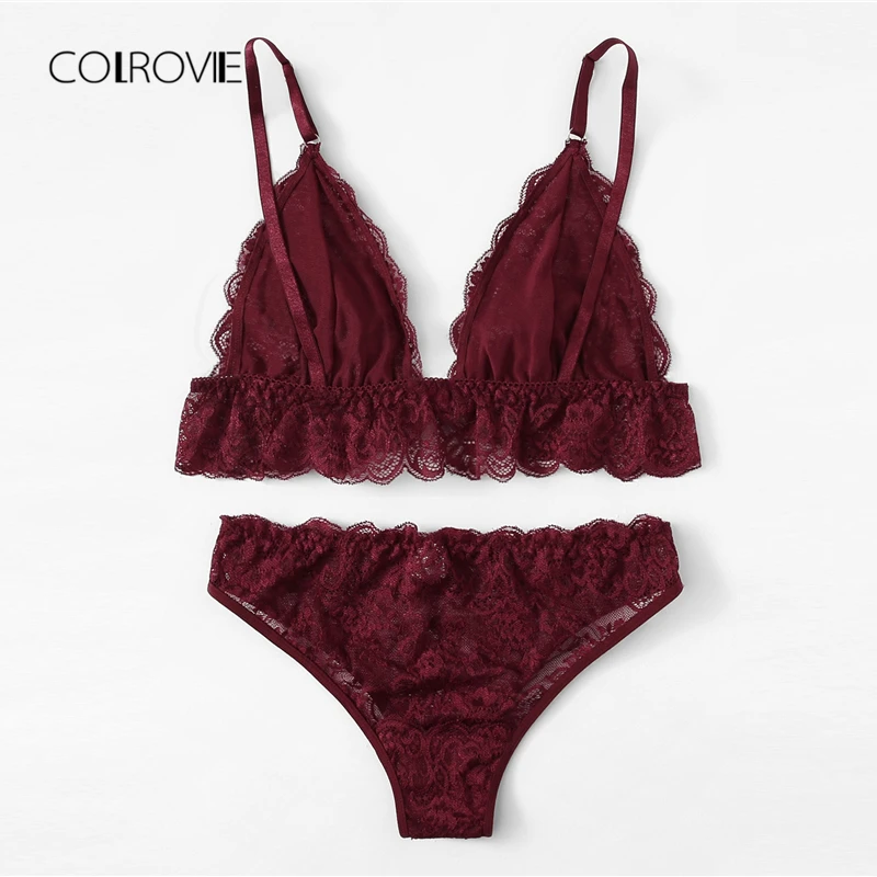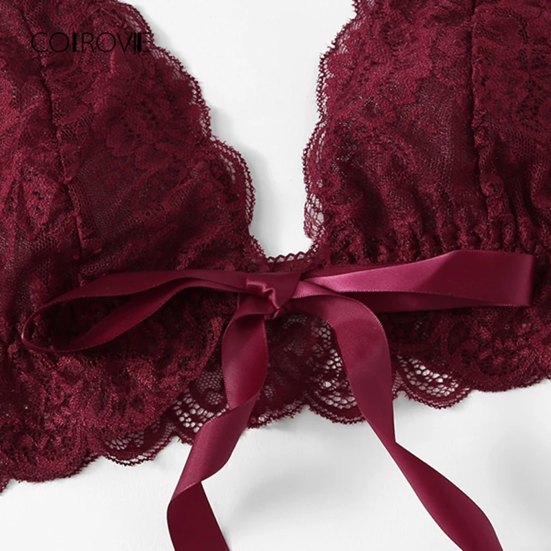Special Offer COLROVIE Bordeaux Geschulpte Trim Lace Lingerie Set Vrouwen Beha En Korte Sets Draadloze Transparante Sexy Ondergoed Bh Set Discount 40% Today!