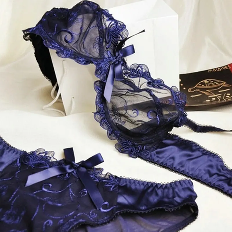 Special Offer Gratis Verzending Bh Korte Sets Bloem Gaas Kant Borduurwerk Ultra Dunne Transparante Sexy Beha Ondergoed Set Marine Blauw zwart Discount 37% Today!