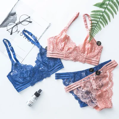 Special Offer Sexy Mousse kant mesh geborduurde VS vrouwen Bralette lingerie bh panty set plunge lace up Ondergoed Set Transparant satijn bras Discount 49% Today!