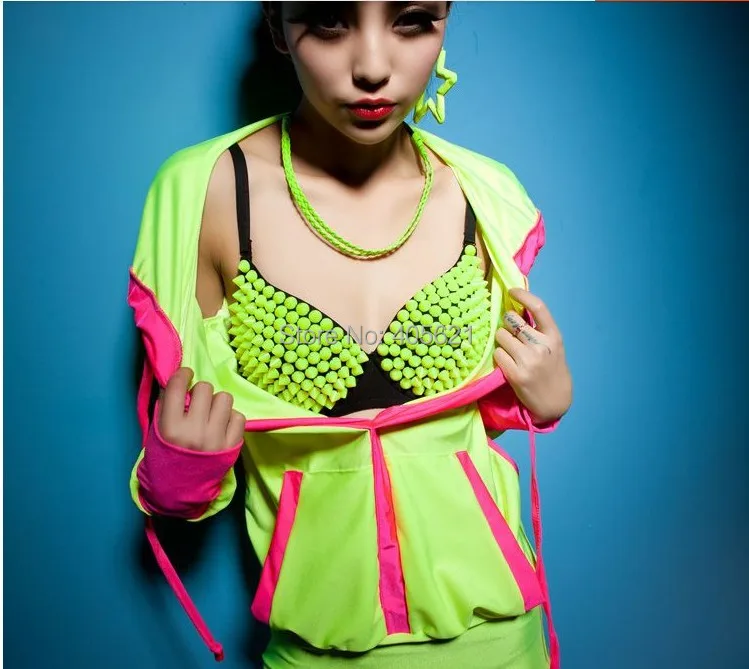 Special Offer Ladygaga Candy Fluorescerende Kleuren Klinknagels Acryl Steentjes Beha Ondergoed DJ Sexy Pole Buikdansen Party Dancer DS Kostuums Discount 0% Today!