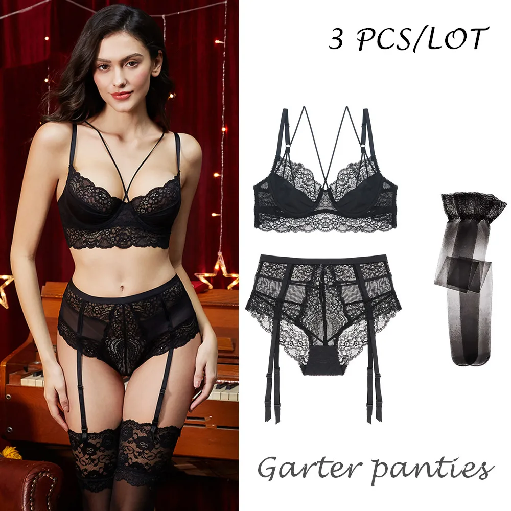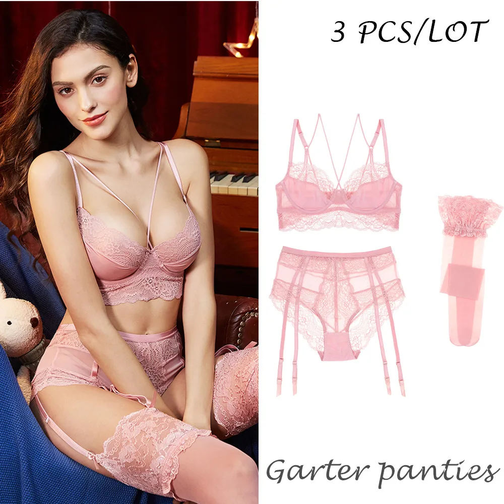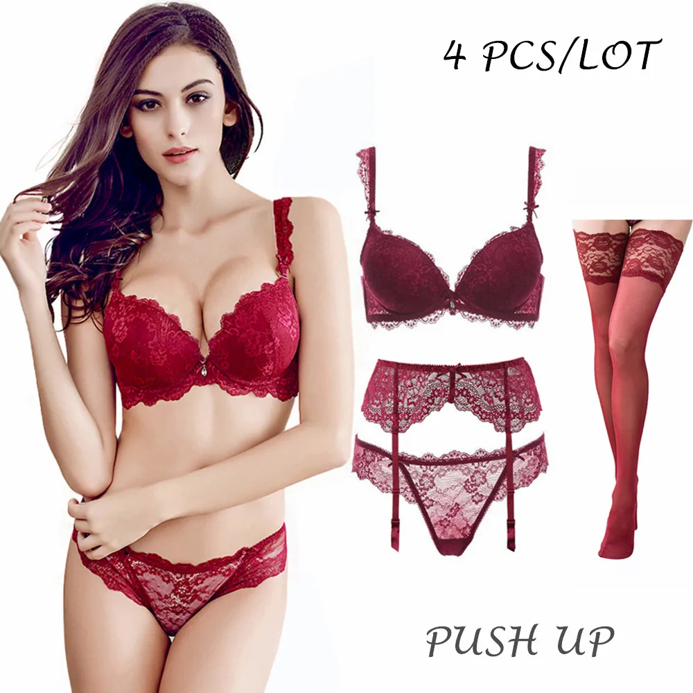 Special Offer Sexy Ondergoed Kanten Beha Push Up Lingerie Set (Bh + Panty + Kousenband + Kousen) 4 Stks partij Discount 55% Today!