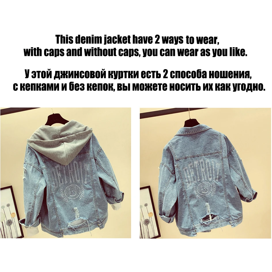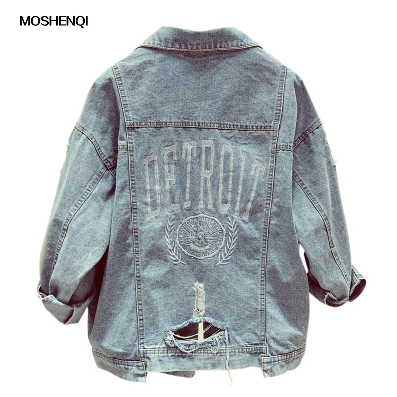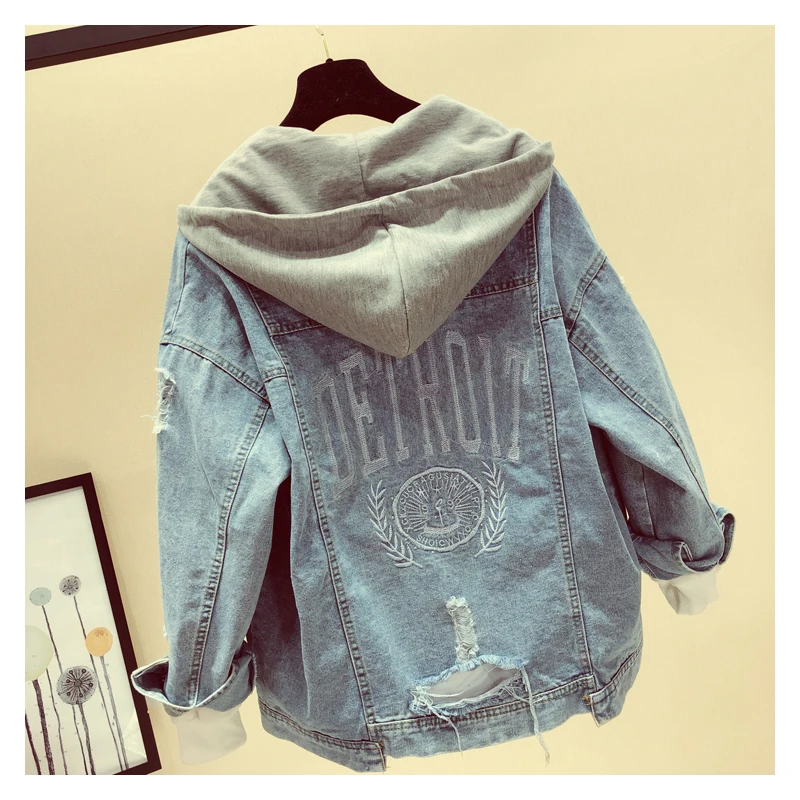 Special Offer MOSHENQI Denim Jas Vrouwen Herfst Jas Ripped Hooded Bovenkleding Jassen Windjack Basic Baggy Vriendje Vrouwelijke Jeans Jas Discount 0% Today!