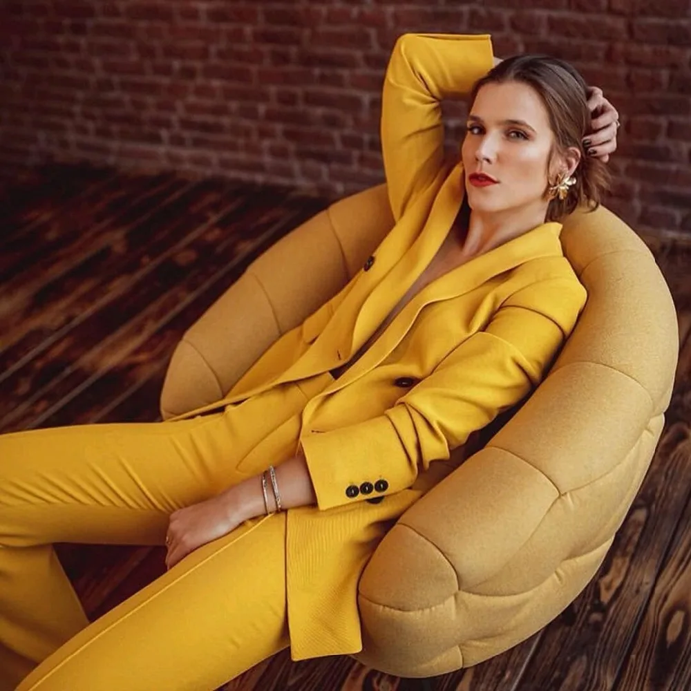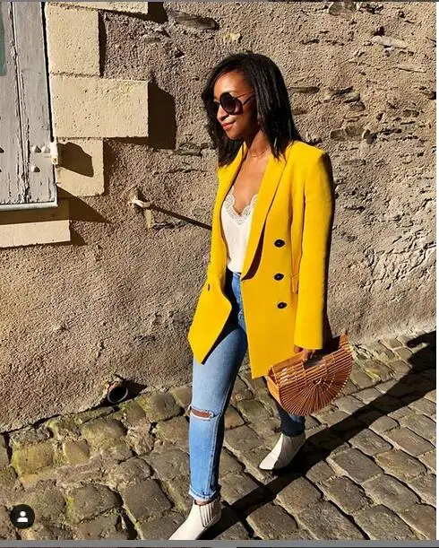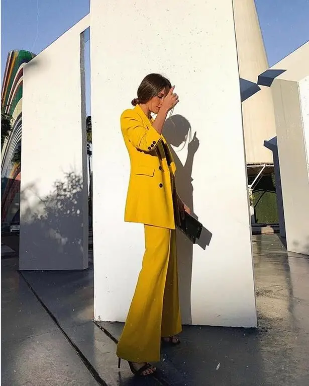 Special Offer 2019 Nieuwe Vrouw Vriendje Gele Kleur Dubbele Knoppen Blazer Vintage Notched Kraag Losse Lange Jasje Jas Bovenkleding 1 set Discount 21% Today!