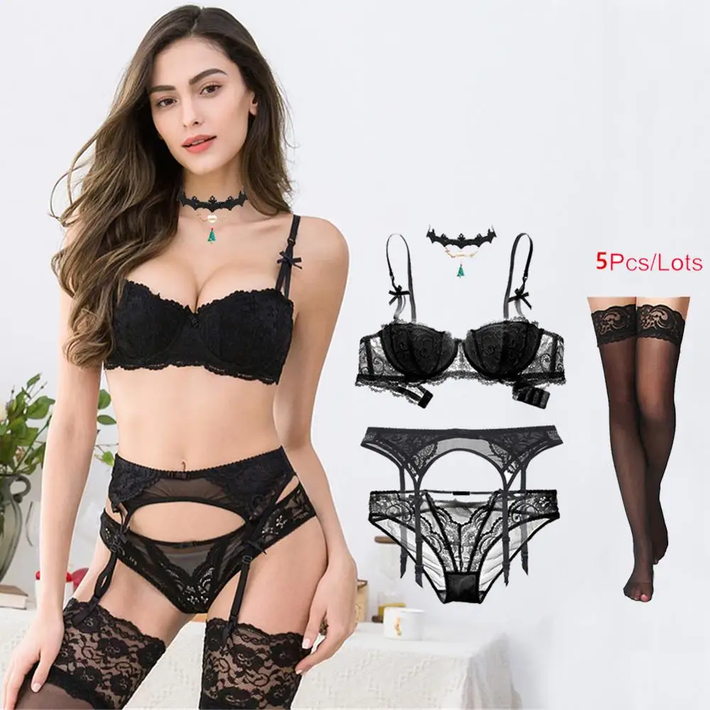 Special Offer Varsbaby sexy kant half cup verzamelen kerst bh set bh + slipje + kousenband + kousen + ketting 4 Stuks Discount 50% Today!